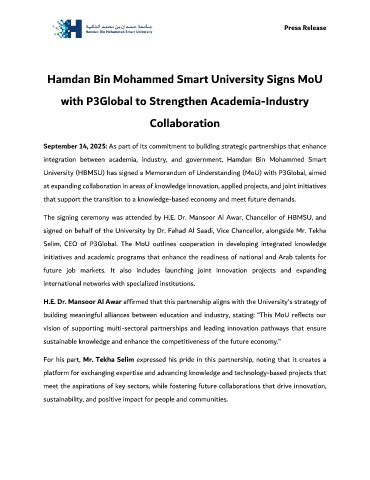 H.E. Dr. Mansoor Al Awar affirmed that this partnership aligns with the University's strategy of