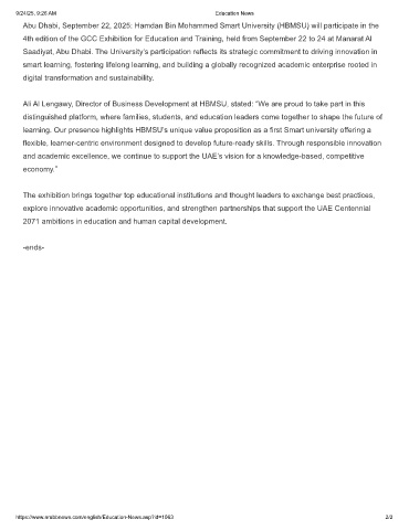 Abu Dhabi, September 22, 2025: Hamdan Bin Mohammed Smart University (HBMSU) will participate in the