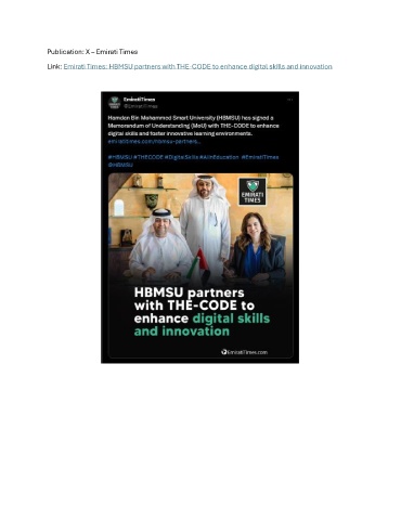 Publication: X – Emirati Times Link: Emirati Times: HBMSU partners with THE-CODE to enhance digital skills and innovation