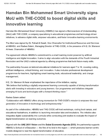 9/23/25, 10:07 AM Hamdan Bin Mohammed Smart University signs MoU with THE-CODE to boost digital skills and innovative learning