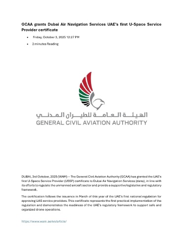 DUBAI, 3rd October, 2025 (WAM) -- The General Civil Aviation Authority (GCAA) has granted the UAE’s