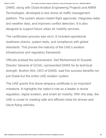 https://sharjahnews.ae/uae-grants-first-drone-airspace-certificate-to-dubai-air-navigation-services/ 2/2