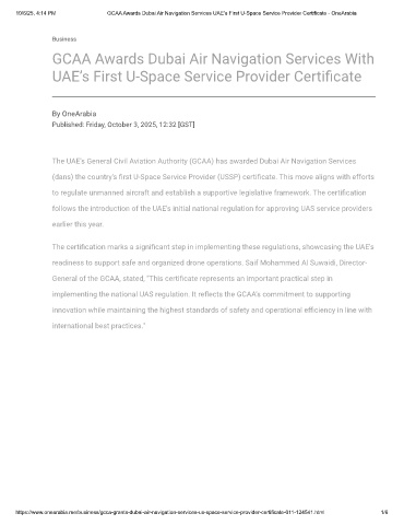 10/6/25, 4:14 PM GCAA Awards Dubai Air Navigation Services UAE's First U-Space Service Provider Certificate - OneArabia