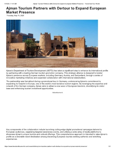 https://www.travelandtourworld.com/news/article/ajman-tourism-partners-with-dertour-to-expand-european-market-presence/ 1/3