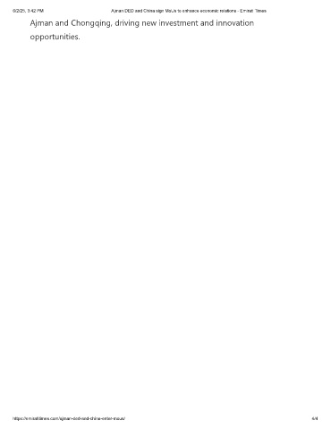 6/2/25, 3:42 PM Ajman DED and China sign MoUs to enhance economic relations - Emirati Times Ajman and Chongqing, driving new investment and innovation opportunities. https://emiratitimes.com/ajman-ded-and-china-enter-mous/ 4/4