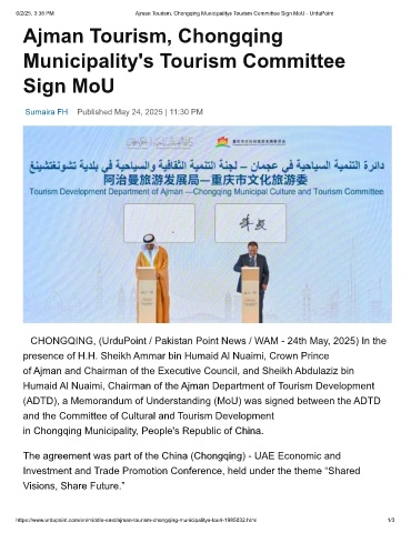 6/2/25, 3:38 PM Ajman Tourism, Chongqing Municipalitys Tourism Committee Sign MoU - UrduPoint
