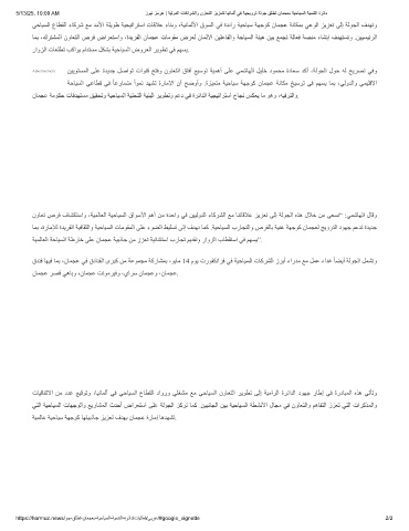 ﻲﺘﻟا ﺔﯿﺣﺎﯿﺴﻟا تﺎﮭﺟﻮﻟاو ﻊﯾرﺎﺸﻤﻟا ثﺪﺣأ ضاﺮﻌﺘﺳا ﻰﻠﻋ ﺔﻟﻮﺠﻟا ﺰﻛﺮﺗ ﺎﻤﻛ .ﻦﯿﺒﻧﺎﺠﻟا ﻦﯿﺑ ﺔﯿﺣﺎﯿﺴﻟا ﺔﻄﺸﻧﻷا لﺎﺠﻣ ﻲﻓ نوﺎﻌﺘﻟاو ﻢھﺎﻔﺘﻟا زﺰﻌﺗ ﻲﺘﻟا تاﺮﻛﺬﻤﻟاو