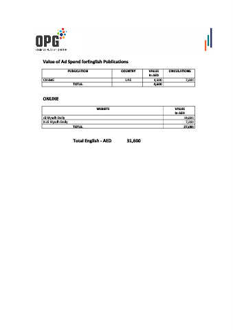 Value of Ad Spend forEnglish Publications PUBLICATION COUNTRY VALUE CIRCULATIONS In AED CBNME UAE 4,600 7,300 TOTAL 4,600 ONLINE WEBSITE VALUE In AED Al Riyadh Daily 19,800 X-Al Riyadh Daily 7,200 TOTAL 27,000 Total English - AED 31,600
