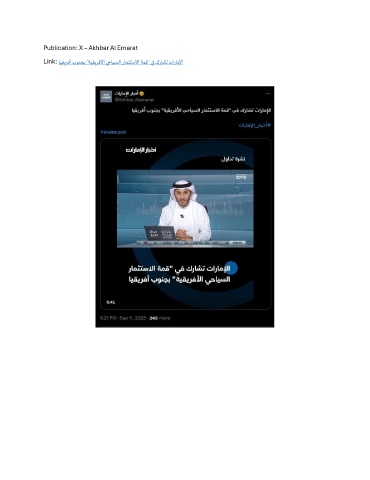 Publication: X – Akhbar Al Emarat Link: ايقيرفأ بونجب "ةيقيرفلأا يحايسلا رامثتسلاا ةمق" يف كراشت تاراملإا