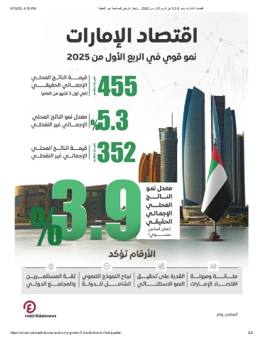 9/10/25, 4:39 PM ﺔﯾطﻔﻧﻟا رﯾﻏ ﺔﻣھﺎﺳﻣﻠﻟ ﻲﺧﯾرﺎﺗ زﺎﺟﻧإو ..2025 نﻣ لوﻷا ﻊﺑرﻟا ﻲﻓ %3.9 وﻣﻧﯾ تارﺎﻣﻹا دﺎﺻﺗﻗا https://al-ain.com/article/uae-economy-grows-5-3-activities-in-first-quarter 3/4