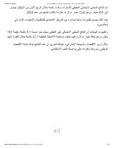 ﻞﺼﯿﻟ ،2025 ﻦﻣ لوﻷا ﻊﺑﺮﻟا لﻼﺧ ﺔﺌﻤﻟﺎﺑ 3.9ـﺑ تارﺎﻣﻺﻟ ﻲﻘﯿﻘﺤﻟا ﻲﻟﺎﻤﺟﻹا ﻲﻠﺤﻤﻟا ﺞﺗﺎﻨﻟا ﺎﻤﻧ