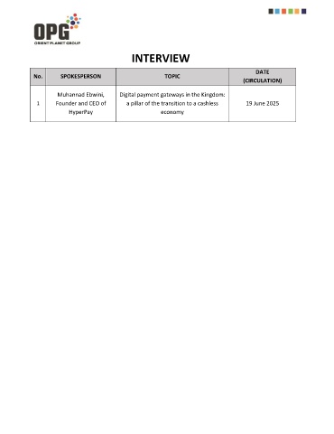 INTERVIEW DATE No. SPOKESPERSON TOPIC (CIRCULATION) Muhannad Ebwini, Digital payment gateways in the Kingdom: 1 Founder and CEO of a pillar of the transition to a cashless 19 June 2025 HyperPay economy