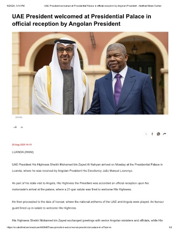 8/26/25, 3:14 PM UAE President welcomed at Presidential Palace in official reception by Angolan President - Aletihad News Center