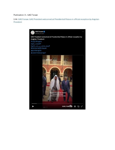 Publication: X – UAE Forsan Link: UAE Forsan: UAE President welcomed at Presidential Palace in official reception by Angolan President