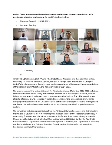 ABU DHABI, 21st August, 2025 (WAM) – The Global Talent Attraction and Retention Committee,