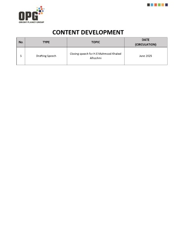 CONTENT DEVELOPMENT No. TYPE TOPIC DATE (CIRCULATION) Closing speech for H.E Mahmood Khaleel 5 Drafting Speech June 2025 Alhashmi