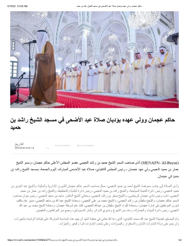 ﻦﺑ ﺪﺷار ﺦﯿﺸﻟا ﺪﺠﺴﻤﺑ ،ﺔﻌﻤﺠﻟا مﻮﯿﻟا ،كرﺎﺒﻤﻟا ﻰﺤﺿﻷا ﺪﯿﻋ ةﻼﺻ ،يﺬﯿﻔﻨﺘﻟا ﺲﻠﺠﻤﻟا ﺲﯿﺋر ، نﺎﻤﺠﻋ ﺪﮭﻋ ﻲﻟو ﻲﻤﯿﻌﻨﻟا ﺪﯿﻤﺣ ﻦﺑ رﺎﻤﻋ