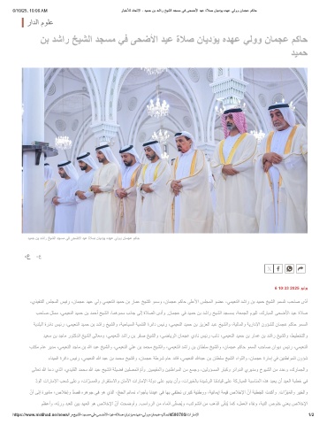 https://www.aletihad.ae/news/ار-ﺦﯾﺷﻟا-دﺟﺳﻣ-ﻲﻓ-ﻰﺣﺿﻷا-دﯾﻋ-ةﻼﺻ-نﺎﯾدؤﯾ-هدﮭﻋ-ﻲﻟوو-نﺎﻣﺟﻋ-مﻛﺎﺣ/4580780/تارﺎﻣﻹا 1/2