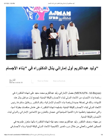 ﻲﻓ هارﻮﺘﻛﺪﻟا ةدﺎﮭﺷ ﻰﻠﻋ ﺪﯿﻌﺳ ﺪﻤﺤﻣ ﻢﯾﺮﻜﻟاﺪﺒﻋ ﺪﯿﻟو ﻲﺗارﺎﻣﻹا ﻞﺼﺣ (MENAFN- Al-Bayan)
