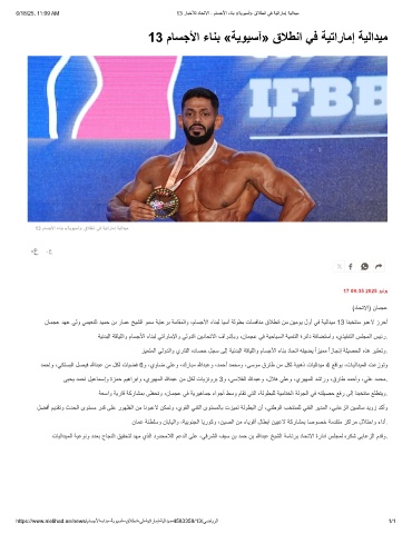 نﺎﻣﺟﻋ دﮭﻋ ﻲﻟو ﻲﻣﯾﻌﻧﻟا دﯾﻣﺣ نﺑ رﺎﻣﻋ ﺦﯾﺷﻟا وﻣﺳ ﺔﯾﺎﻋرﺑ ﺔﻣﺎﻘﻣﻟاو ،مﺎﺳﺟﻷا ءﺎﻧﺑﻟ ﺎﯾﺳآ ﺔﻟوطﺑ تﺎﺳﻓﺎﻧﻣ قﻼطﻧا نﻣ نﯾﻣوﯾ لوأ ﻲﻓ ﺔﯾﻟادﯾﻣ 13 ﺎﻧﺑﺧﺗﻧﻣ وﺑﻋﻻ زرﺣأ
