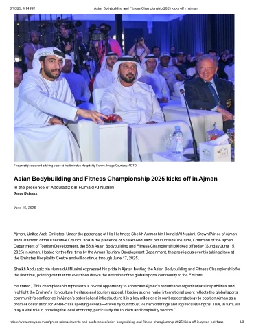 Sheikh Abdulaziz bin Humaid Al Nuaimi expressed his pride in Ajman hosting the Asian Bodybuilding and Fitness Championship for