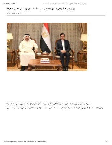 5/30/25, 2:19 PM دﻠﺑﻟا ىدﺻ ةﺎﻧﻗ | ﺔﻓرﻌﻣﻠﻟ موﺗﻛﻣ لآ دﺷار نﺑ دﻣﺣﻣ ﺔﺳﺳؤﻣﻟ يذﯾﻔﻧﺗﻟا رﯾدﻣﻟا ﻲﻘﺗﻠﯾ ﺔﺿﺎﯾرﻟا رﯾزو