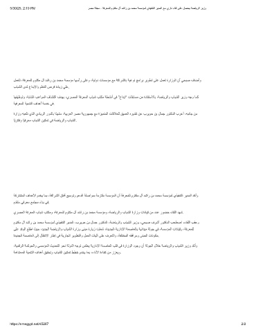 ﻰﻠﻋ دﻓوﻟا ﻊﻠطا ثﯾﺣ ،دﯾدﺟﻟا ﺔﺿﺎﯾرﻟاو بﺎﺑﺷﻟا ةرازو ﻰﻧﺑﻣ ةرﺎﯾز تﻠﻣﺷ ،ةدﯾدﺟﻟا ﺔﯾرادﻹا ﺔﻣﺻﺎﻌﻟﺎﺑ ﺔﯾﻧادﯾﻣ ﺔﻟوﺟ ﻲﻓ ،ﺔﺳﺳؤﻣﻟا تادﺎﯾﻗو ،ﺔﻓرﻌﻣﻠﻟ