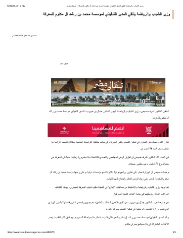 5/30/25, 2:10 PM رﺻﻣ لوﺻأ - ﺔﻓرﻌﻣﻠﻟ موﺗﻛﻣ لآ دﺷار نﺑ دﻣﺣﻣ ﺔﺳﺳؤﻣﻟ يذﯾﻔﻧﺗﻟا رﯾدﻣﻟا ﻲﻘﺗﻠﯾ ﺔﺿﺎﯾرﻟاو بﺎﺑﺷﻟا رﯾزو