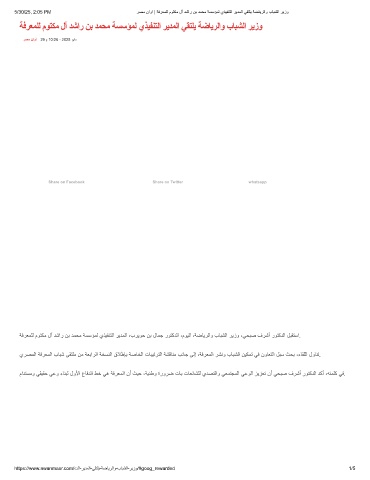 5/30/25, 2:05 PM رﺻﻣ ناوا | ﺔﻓرﻌﻣﻠﻟ موﺗﻛﻣ لآ دﺷار نﺑ دﻣﺣﻣ ﺔﺳﺳؤﻣﻟ يذﯾﻔﻧﺗﻟا رﯾدﻣﻟا ﻲﻘﺗﻠﯾ ﺔﺿﺎﯾرﻟاو بﺎﺑﺷﻟا رﯾزو