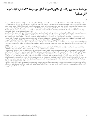 "ﺔﯿﻠﻘﺻ ﻲﻓ ﺔﯿﻣﻼﺳﻹا ةرﺎﻀﺤﻟا" ﺔﻋﻮﺳﻮﻣ ﺔﻓﺮﻌﻤﻠﻟ مﻮﺘﻜﻣ لآ ﺪﺷار ﻦﺑ ﺪﻤﺤﻣ ﺔﺴ ﱠ ﺳﺆﻣ ﺖﻘﻠطأ � 2025 ﻮﻳﺎﻣ 7 ،ةﺪﺤﺘﻤﻟا ﺔﯿﺑﺮﻌﻟا تارﺎﻣﻹا ،ﻲﺑد