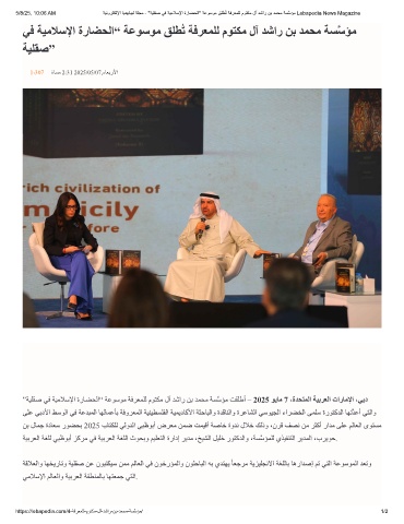 5/8/25, 10:06 AM ﺔﯾﻧورﺗﻛﻟﻹا ﺎﯾدﯾﺑﺎﺑﯾﻟ ﺔﻠﺟﻣ - "ﺔﯾﻠﻘﺻ ﻲﻓ ﺔﯾﻣﻼﺳﻹا ةرﺎﺿﺣﻟا" ﺔﻋوﺳوﻣ ﻖﻠطُﺗ ﺔﻓرﻌﻣﻠﻟ موﺗﻛﻣ لآ دﺷار نﺑ دﻣﺣﻣ ﺔﺳﱠﺳؤﻣ Lebapedia News Magazine