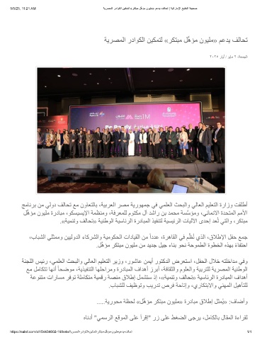 5/5/25, 11:21 AM ﺔﯾرﺻﻣﻟا رداوﻛﻟا نﯾﻛﻣﺗﻟ «رﻛﺗﺑﻣ لﱠھؤﻣ نوﯾﻠﻣ» مﻋدﯾ فﻟﺎﺣﺗ | ﺔﯾﺗارﺎﻣﻹا ﺞﯾﻠﺧﻟا ﺔﻔﯾﺣﺻ