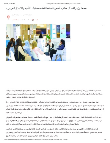 ،«ﺔﻓرﻌﻣ ﺔﺣارﺗﺳا» ةدﺋارﻟا ﺎﮭﺗردﺎﺑﻣ ﺔﻠظﻣ تﺣﺗو ،2025 بﺎﺗﻛﻠﻟ ﻲﻟودﻟا ﻲﺑظوﺑأ ضرﻌﻣ ﻲﻓ ﺎﮭﺗﻛرﺎﺷﻣ لﻼﺧ ،ﺔﻓرﻌﻣﻠﻟ موﺗﻛﻣ لآ دﺷار نﺑ دﻣﺣﻣ ﺔﺳﺳؤﻣ تﻣظﻧ