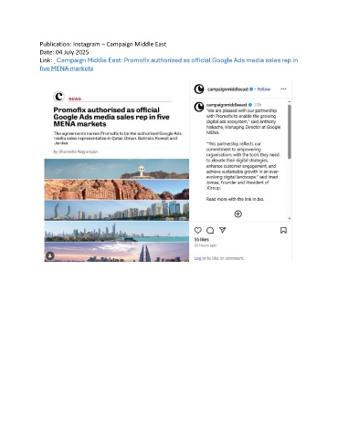 Publication: Instagram – Campaign Middle East Date: 04 July 2025 Link: Campaign Middle East: Promofix authorised as official Google Ads media sales rep in five MENA markets