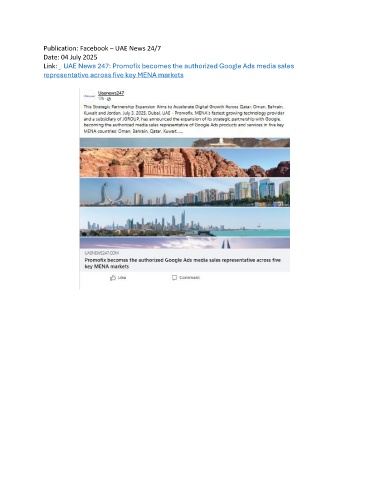 Publication: Facebook – UAE News 24/7 Date: 04 July 2025 Link: UAE News 247: Promofix becomes the authorized Google Ads media sales representative across five key MENA markets