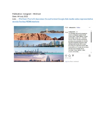 Publication: Instagram – Mid East Date: 04 July 2025 Link: - Mid East: Promofix becomes the authorized Google Ads media sales representative across five key MENA markets