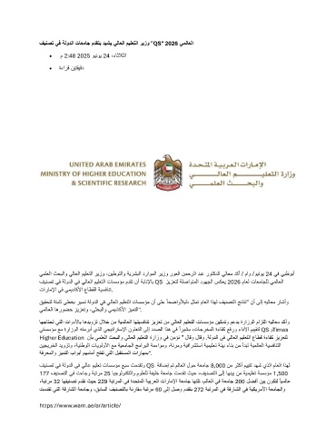 فينصت يف ةلودلا تاعماج مدقتب ديشي يلاعلا ميلعتلا ريزو "QS" 2026 يملاعلا