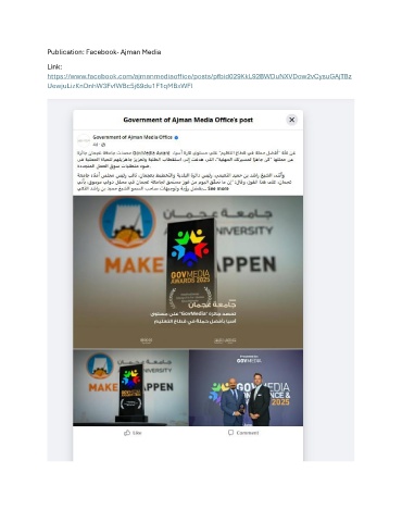 Publication: Facebook- Ajman Media Link: https://www.facebook.com/ajmanmediaoffice/posts/pfbid029KkL92BWDuNXVDow2vCysuGAjTBz UewjuLizKnDnhW3FvfWBc5j69du1F1qMBxWFl