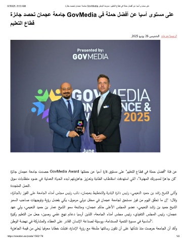 ةزﺋﺎﺟ نﺎمجﻋ ﺔﻌﻣﺎﺟ تدصﺣ GovMedia Award ﺎﻬتﻠمﺣ نﻋ ﺎيﺳآ ةرﺎﻗ ى وتسﻣ ﻰﻠﻋ ”ميﻠﻌتﻟا عﺎطﻗ ﻲﻓ ﺔﻠمﺣ ﻞضﻓأ“ ﺔئﻓ نﻋ