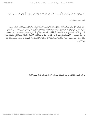 ً اﺪﻏ ﻖﻠﻄﻨﺘﺳ ﻲﺘﻟا ﺔﯿﻧﺪﺒﻟا ﺔﻗﺎﯿﻠﻟاو مﺎﺴﺟﻷا ءﺎﻨﺒﻟ ﺎﯿﺳآ ﺔﻟﻮﻄﺑ نﺄﺑ ﮫﺘﻘﺛ ﻦﻋ ﺎًﺑﺮﻌﻣ ،ﻲﻟوﺪﻟا دﺎﺤﺗﻻاو نﺎﻤﺠﻋ ةرﺎﻣإ ﻦﯿﺑ