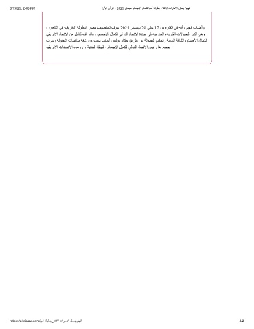 ، هﺮھﺎﻘﻟا ﻲﻓ ﮫﯿﻘﯾﺮﻓﻻا ﺔﻟﻮﻄﺒﻟا ﺮﺼﻣ ﻒﯿﻀﺘﺴﺗ فﻮﺳ 2025 ﺮﺒﻤﺴﯾد 20 ﻲﺘﺣ 17 ﻦﻣ هﺮﺘﻔﻟا ﻲﻓ ﮫﻧأ ، ﻢﯿﮭﻓ فﺎﺿأو