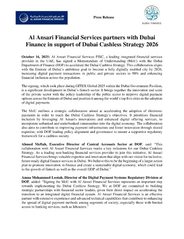 DOF, added: “Signing the MoU with Al Ansari Financial Services represents an important step