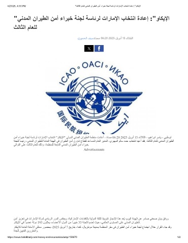 ﻦﻣأ ءاﺮﺒﺧ ﺔﻨﺠﻟ ﺔﺳﺎﺋﺮﻟ تارﺎﻣﻹا بﺎﺨﺘﻧا "وﺎﻜﯾﻹا" ﻲﻟوﺪﻟا ﻲﻧﺪﻤﻟا ناﺮﯿﻄﻟا ﺔﻤﻈﻨﻣ تدﺎﻋأ - ًءﺎﺴﻣ 06:20 2025 ﻞﯾﺮﺑأ 15 ءﺎﺛﻼﺜﻟا - ﻢﯿھاﺮﺑا ﺮﺳﺎﯾ - ﻲﺒظﻮﺑا