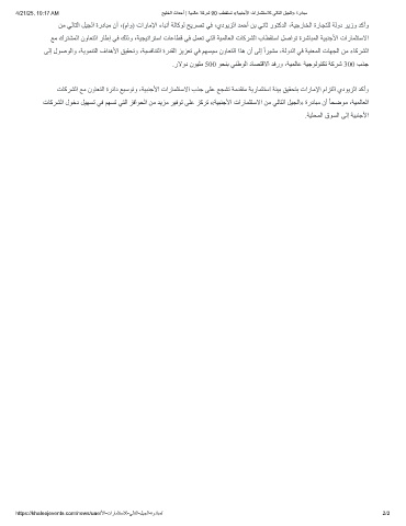 تﺎﻛﺮﺸﻟا ﻊﻣ نوﺎﻌﺘﻟا ةﺮﺋاد ﻊﯿﺳﻮﺗو ،ﺔﯿﺒﻨﺟﻷا تارﺎﻤﺜﺘﺳﻻا بﺬﺟ ﻰﻠﻋ ﻊﺠﺸﺗ ﺔﻣﺪﻘﺘﻣ ﺔﯾرﺎﻤﺜﺘﺳا ﺔﺌﯿﺑ ﻖﯿﻘﺤﺘﺑ تارﺎﻣﻹا ماﺰﺘﻟا يدﻮﯾﺰﻟا ﺪﻛأو