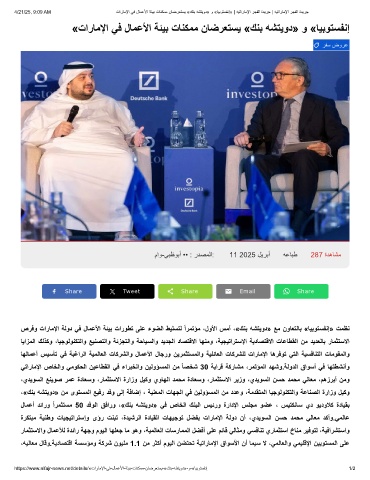 صرﻓو تارﺎﻣﻹا ﺔﻟود ﻲﻓ لﺎﻣﻋﻷا ﺔﺋﯾﺑ تاروطﺗ ﻰﻠﻋ ءوﺿﻟا طﯾﻠﺳﺗﻟ ًارﻣﺗؤﻣ ،لوﻷا سﻣأ ،«كﻧﺑ ﮫﺷﺗﯾود» ﻊﻣ نوﺎﻌﺗﻟﺎﺑ «ﺎﯾﺑوﺗﺳﻔﻧإ» تﻣظﻧ