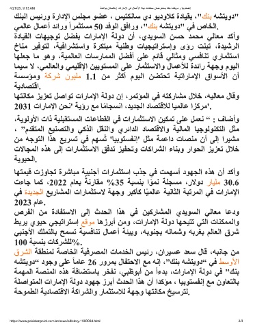 ﻲﻤﻟﺎﻋ لﺎﻤﻋأ ﺪﺋارو ًاﺮﻤﺜﺘﺴﻣ 50 ﺪﻓﻮﻟا ﻖﻓارو ،"ﻚﻨﺑ ﮫﺸﺘﯾود" ﻲﻓ صﺎﺨﻟا.