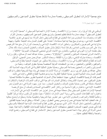 تارﺎﻣﻹا ﺔﯿﻌﻤﺟ" ـﻟ ﻰﻘﯿﺳﻮﻤﻠﻟ ﺔﯿﻋﺎﻤﺠﻟا ةرادﻹا ﺔﺼﺧر دﺎﺼﺘﻗﻻا ةرازو ﺖﺤﻨﻣ / ماو /ﻞﯾﺮﺑأ 10 ﻲﻓ ﻲﺒظﻮﺑأ