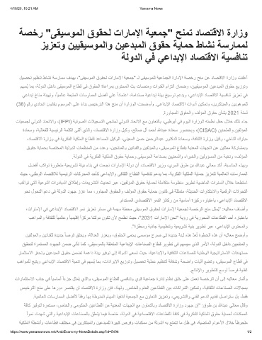 ،تارﺎﻣﻹا ﻲﻓ ﻲﻋادﺑﻹا دﺎﺻﺗﻗﻻا وﻣﻧ زﯾزﻌﺗ رﺎﺳﻣ ﻲﻓ ﺔﻣﮭﻣ ﺔطﺣﻣ ﻰﻘﯾﺳوﻣﻟا قوﻘﺣﻟ تارﺎﻣﻹا ﺔﯾﻌﻣﺟﻟ ﺔﺻﺧرﻟا ﺢﻧﻣ لﺛﻣُﯾ" :ﮫﯾﻟﺎﻌﻣ فﺎﺿأو