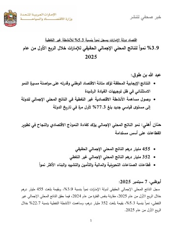 مﻫرد رﺎﯿﻠﻤ 455 تﻐﻠﺒ ﺔﻤﯿﻘﺒو ،% 3.9 ﺔﺒﺴﻨﺒ ً اوﻤﻨ تارﺎﻤﻹا ﺔﻟودﻟ ﻲﻘﯿﻘﺤﻟا ﻲﻟﺎﻤﺠﻹا ﻲﻠﺤﻤﻟا ﺞﺘﺎﻨﻟا لﺠﺴ