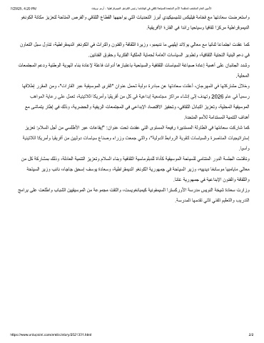 نوﺎﻌﺗﻟا لﺑﺳ لوﺎﻧﺗ ،ﺔﯾطارﻘﻣﯾدﻟا وﻐﻧوﻛﻟا ﻲﻓ ثارﺗﻟاو نوﻧﻔﻟاو ﺔﻓﺎﻘﺛﻟا ةرﯾزو ،وﺑﻣﯾدﻧ ﺎﻣ ﻲﺑﯾﻠﯾإ دﻧﻻوﯾ ﻲﻟﺎﻌﻣ ﻊﻣ ﺎﯾﺋﺎﻧﺛ ﺎﻋﺎﻣﺗﺟا تدﻘﻋ ﺎﻣﻛ